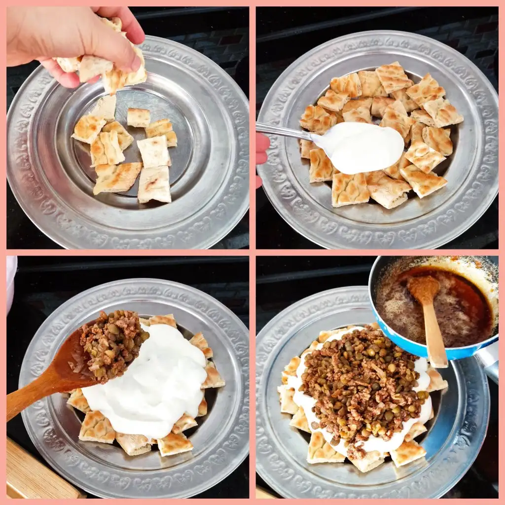 Pideleri tabana dizip üzerine yoğurdumuzu gezdiriyoruz. Sonra kıymalı harcı ekleyip son olarak cooossss dokunuşunu yapıyoruz( tereyağda toz biber yakıyoruz yani🤭)