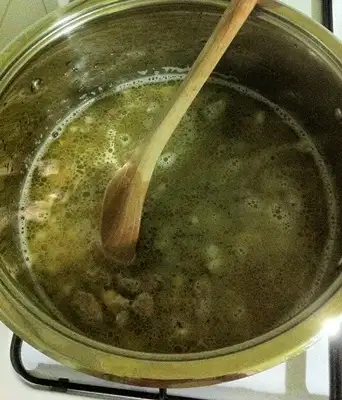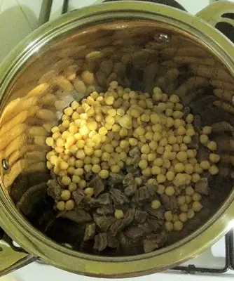 Diger bir tencerede eti kavurun üzerine nohut et suyu ve haslanan yuvarlamalari ilave edin.