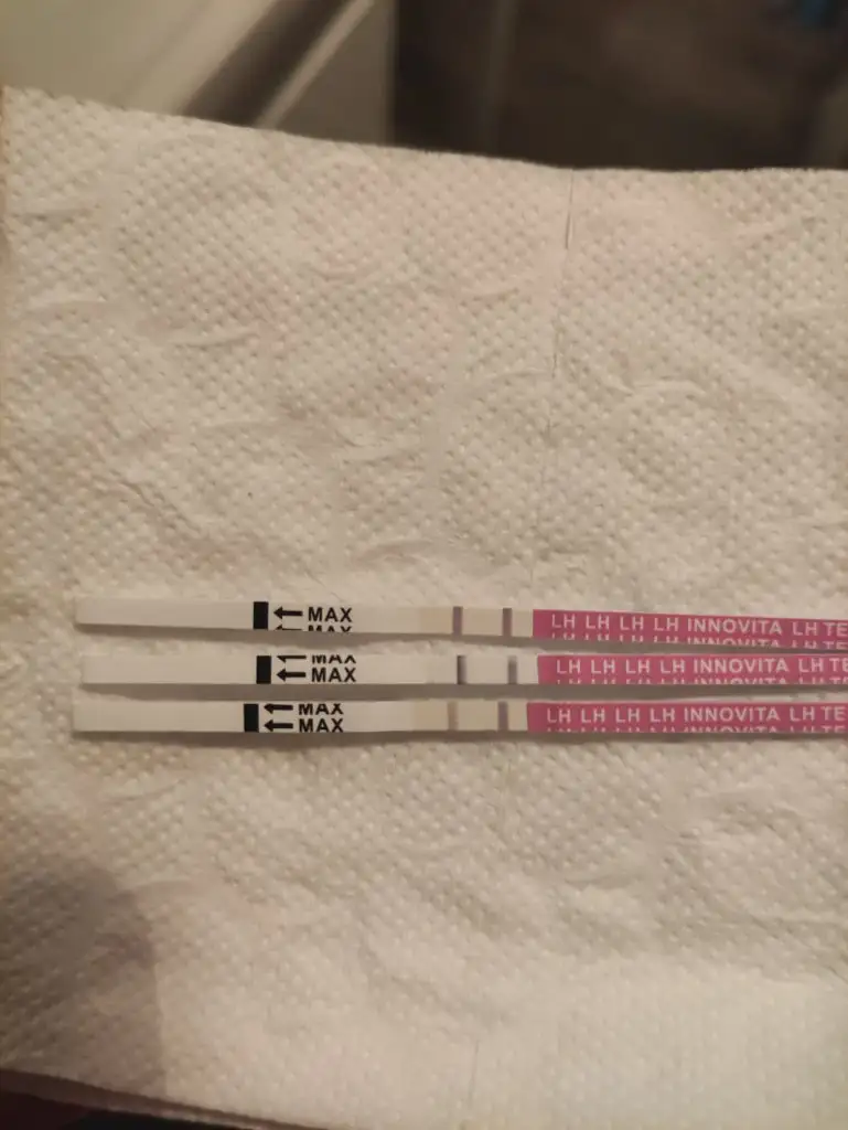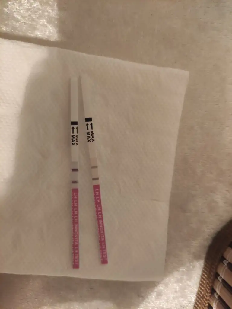 Biraz daha silik olan dün ki daha kırmızı olan az önce yaptığım ovulasyon testi