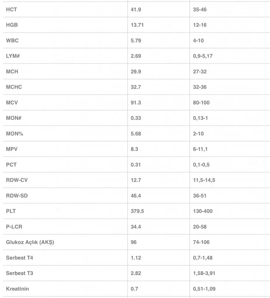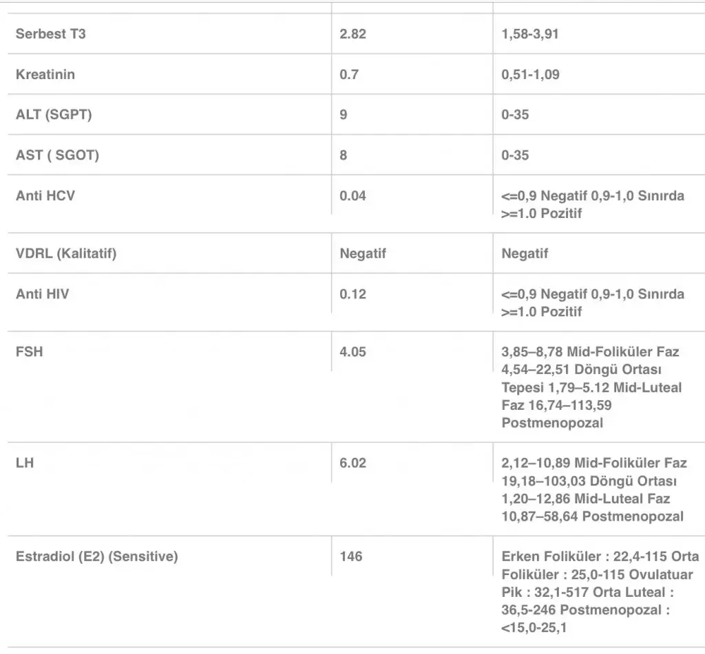 Merhaba kızlar 8 aydır bebek düşünüyoruz henüz nasip olmadı.Bu ay doktora gidip muayene olmak istedim.Normalde adetlerim düzenlidir ve 6 gün sürüyor.Adetimin 3 günü doktora gittim alttan muayene etti ve rahim duvarının,rahim ağzının güzel olduğunu sağda 4 solda 8 yumurta olduğunu söyledi bi hafta sonra tekrar gel ovülasyon öncesi yumurtalarına tekrar bakalım dedi ve birtakım testler istedi.Testleri aynı gün sağlık sigorta problemi yüzünden yaptıramadım.Bugün yani adetin 5 günü yaptırdım,doktora sordum yarın son günü bugün mü geleyim yarın mı diye bugün yaptır dedi.Öncelikle sorun şu bu ay kanamam çok az oldu ve 3. Günden beri sadece leke olarak devam etti acaba testleri etkiler mi?Şimdi baktım test sonuçlarım çıkmış ama referans değerleri falan bana çok karışık geldiği için anlayamadım tecrübeli arkadaşlar varsa yardımcı olabilir mi yoksa çarşamba gününe kadar çatlayacağım.🙈🙈🌸