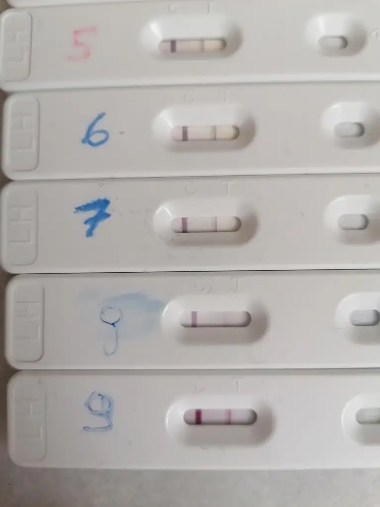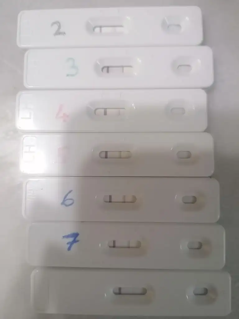 Merhaba bende ovi testi kullandım bir bakabılır mısınız sonuncuda hata mı var cunku 2.cızgı 1.den koyu olması gerekli denildi ama olmadıOvulasyonu da gebeliği de labaquik ile öğrendim hatta idrar testim o kadar erkenden çok silik bir çizgi verdi ki gittiğim de 13,41 di bebeğim ve ne kadar bekletirsen beklet eğer gebelik yoksa ikinci çizgi asla oluşmadı ovulasyonda kaset gebelikte çubuk test kullandım
