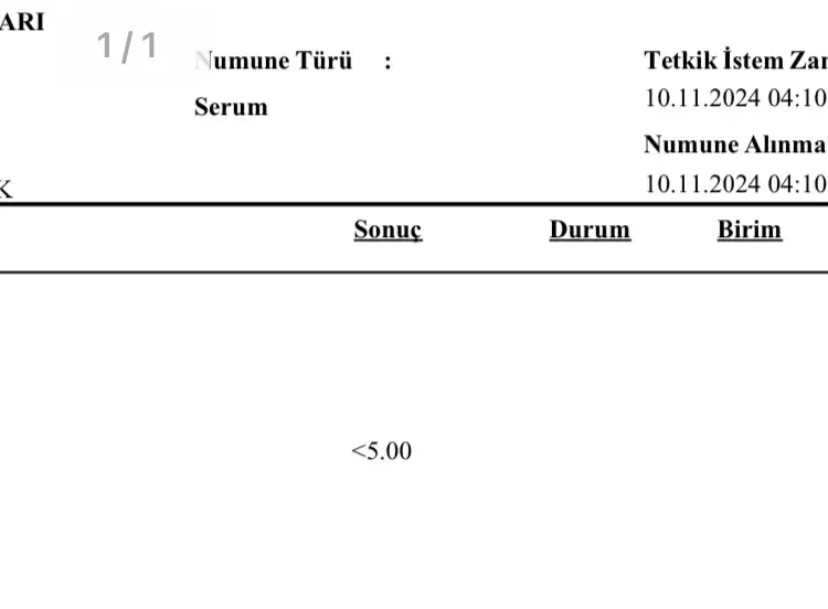 Bununla ilgili de ufak bir arastirma yaptim mesela deger <2.00 den kucukse bu sekilde yaziyor diye biliyorum ...Değer <5 olarak gözüküyor. Eğer laboratuvar sistemi böyleyse 5 den küçük tüm değerleri böyle gösterir. Bir arayıp sormanız gerekir. Negatif gözüküyor şu an.