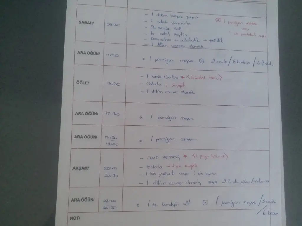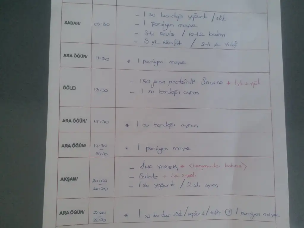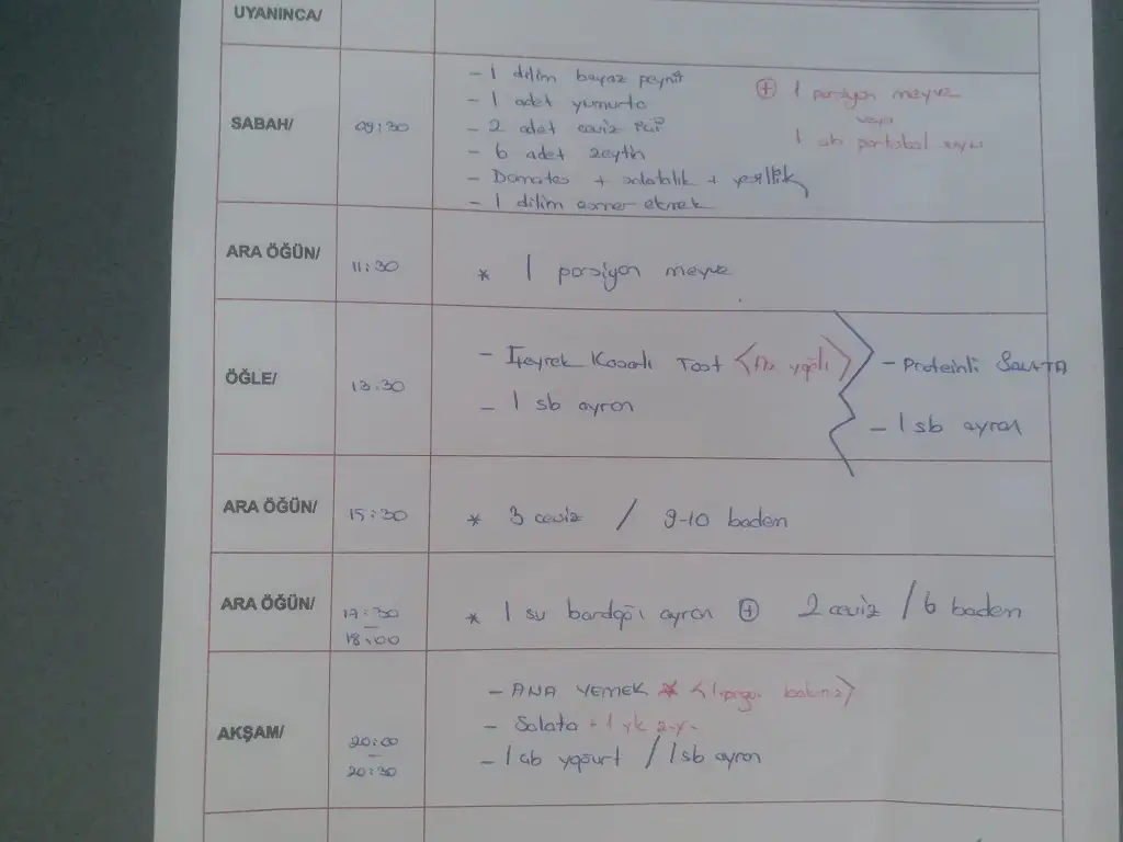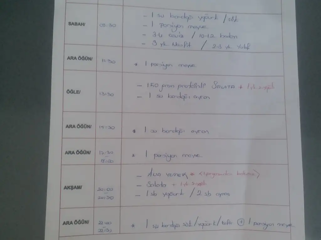 Bu program vücut kitle indeksi 24-26 aralığında biri için hazırlanmış yani ortalama 1600 kalori değerinde.Az sonra aynı programın ortalama 1800 kalori olanını yanı vücut kitle indeksi 27-29 gibi olanlar için olanını paylaşacağım.Meyve sevmeyeler ara öğünü badem/ceviz/fındıkla değiştirebilir.Ya da 1 ara öğünde ayran,1 ara öğünde meyve 1 ara öğünde badem türü tercih edebilirsiniz.Ben genelde böyle yapıyorum Sürekli meyve yenirse şeker yüklemesi fazla oluyor