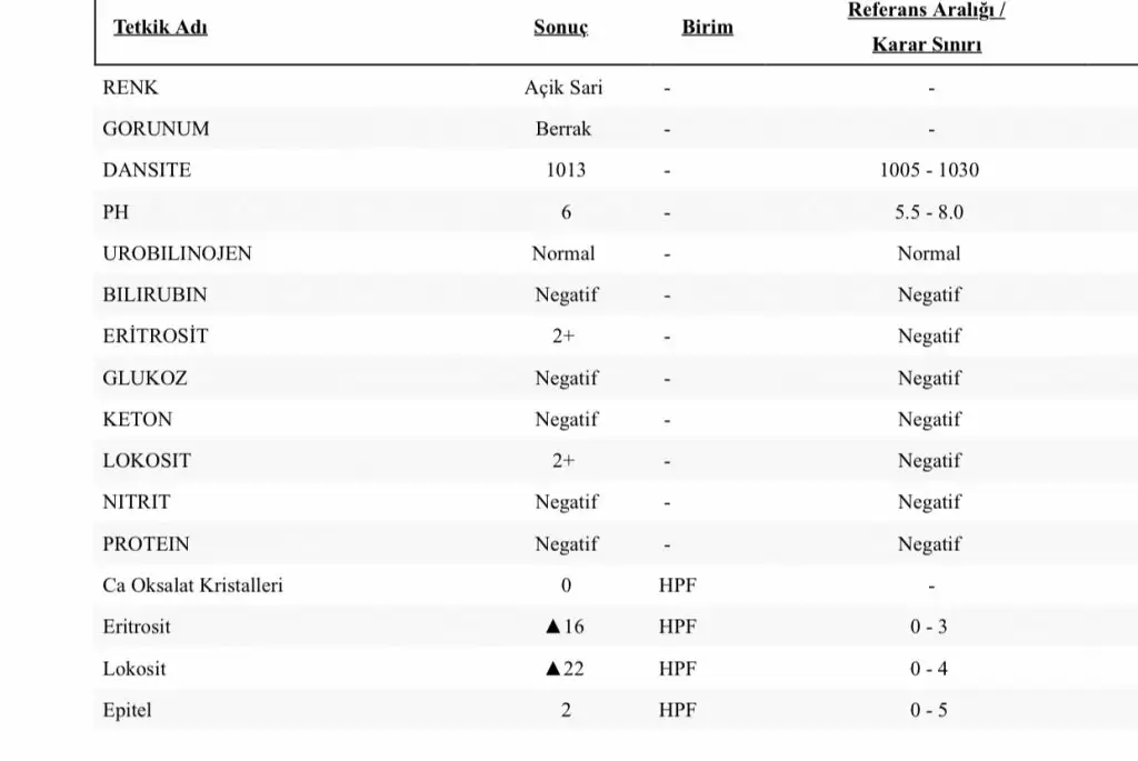 merhabalar umarım sizin adınıza her şey yolundadır. Bende bugün idrar testi sonucumu aldım. Aynı sizin gibi eritrosit 12 çıkmış. Henüz doktoruma göstermediğim için bir fikir almak istedim. Size nasıl bir yorum yapıldı doktorunuz tarafından? Açıkçası biraz endişelendim.