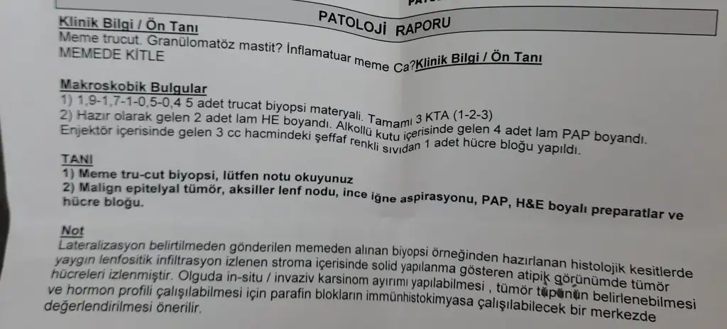 Hiç anlamadım sonucu ama ben kötü olduğunu düşünmüyorum iyi bi hastaneye ve profa görünmeni tavsiye ederim. Benim sonuçlar çıkınca da paylaşırımMerhaba bende 7+5 haftalık hamileym. 4 ay önce göğsümde şişlik fark ettim. 1 ay önce biyopsi oldum sonucum eksik çıkmış d3di doktor. Büyük hastaneye git dedi ama rapor da malinng tümör yazıyor . Sonucunuz çıkınca yazar misnz. Ben sonucumu atayım sz bakın