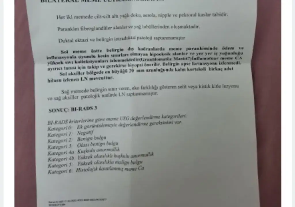 Buda ultrason sonucmArkadaşlar ben bir ay önce elime gelen bi kitleyle doktora gittim ve 16 haftalık hamileydim. Ultrason da sıkıntı olmadığını malignite kriteri taşıyan özellik izlenmemiştir lenf nodülü yoktur yazıyordu. Bir hafta sonra başka hastaneye gittim. Orda da kötü bişe olmadığını hamileliğe bağlı süt kanallarında çamurlaşma kanlaşma olduğunu tıkanıklık olduğunu söyledi ve aynı sonucu verdi. Ben iki hafta sonra büyüdüğünü hissettiğim için başka doktora gittim ve benden direk acil biyopsi istedi. bilgisi olan var mı bir hafta oldu biyopsi vereli yemeden içmeden kesildim uyuyamıyorum korkudan kanamam bile oldu şu an 20 haftalık hamileyim. Rapor sonucunda böyle yazıyor BİLATERAL MEME US RAPORU Sol aksiller kuyrukta ~ 12x23 mm boyutunda korteks kalınlığı asimetrik artmış LAP izlendi. Sol meme saat 3 hizasında meme başından 14 mm uzaklıkta ciltten ~ 3 mm derinlikte ~ 18x40x32 mm'lik bir alanda , bu alan inferolateralinde bu alanda ~ 15 mm uzaklıkta ~ 17x40x47 mm'lik bir alanda Doppler incelemede yoğun vasküler sinyal alınan birbiri ile ilişkili hipoekoik tübüler lezyonlar izlendi (hasta kısa sürede bu alanların hızla büyüdüğünü belirtmektedir). Sağ memede solid ya da kistik yapıda yer kaplayan lezyon ayırdedilmemiştir. Sağ aksiller alanlar tabii görünümdedir. US SONUÇ: Kategori 4c bulgular.YORUM ÖNERİ: Hastanın sol memedeki büyük olan lezyondan ve sol aksiller LAP'dan US eşliğinde kor bx önerilir.