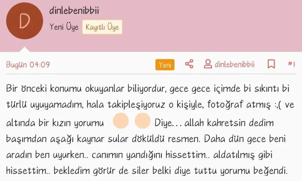 Bir önceki konumu okuyanlar biliyordur, gece gece içimde bi sıkıntı bi türlü uyuyamadım, hala takipleşiyoruz o kişiyle, fotoğraf atmış :,( ve altında bir kızın yorumuDiye… allah kahretsin dedim başımdan aşağı kaynar sular döküldü resmen. Daha dün gece beni aradın ben uyurken.. canımın yandığını hissettim.. aldatılmış gibi hissettim.. bekledim görür de siler belki diye tuttu yorumu beğendi. Hiç mi düşünmüyorsun bu kız bunu görecek ne düşünür diye. Bide bana palavra atıyor ben kimseyle konuşmuyorum benim hayatımda biri olamaz.. yani kızı da görseniz beni bunun için mi bıraktın dedim.. bunu kendimi övmek için söylemiyorum asla lütfen yanlış anlamayın ama gerçekten öyle.. uykumdan oldum şu saatte çok moralim bozuldu