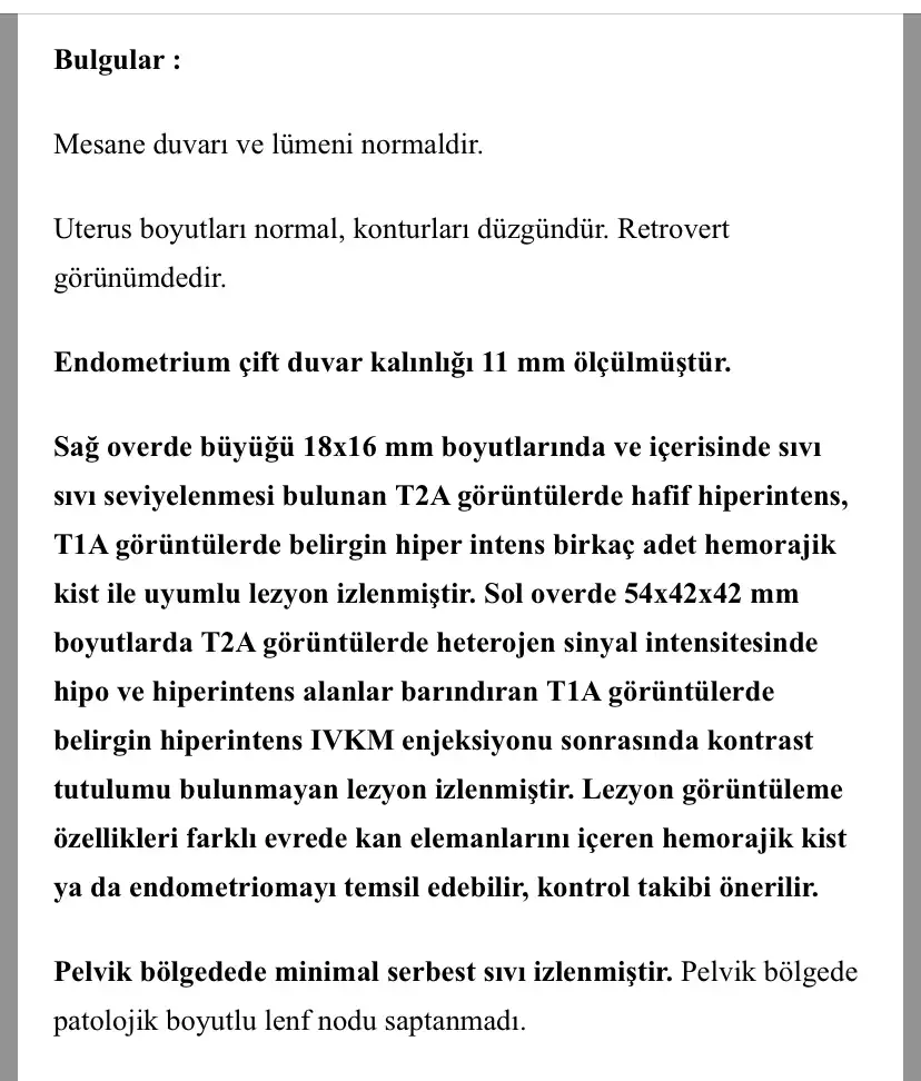 MR raporum çıktı. Hemorojik kist değildir diye düşünüyorum çünkü 1 yıldır geçmedi çikolata kisti olabilir denmiş bence benimki çikolata kisti gibi düşünüyorum ben. Yarın doktora gideceğim umarim ameliyat istemez