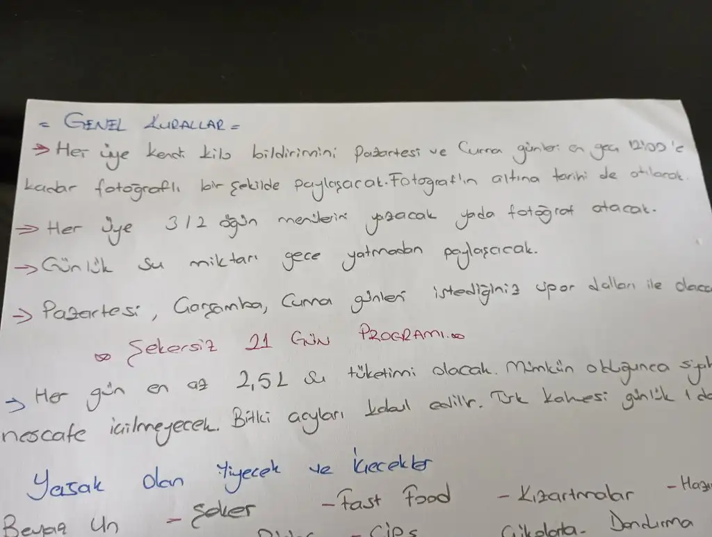 Ben de başladım tamam o zaman burdan devam edelim ben kahvaltımı 11:15 te yaptım sirkeli suyumu içtim. 2 l suyumu da içtim kilomda şu an da 61.40 kızlar güncel olarak pazartesi ve cuma günleri tartı günü unutmayın. Menü olarak yazar ya da çekip atabiliriz. Ama eksiksiz yapalım olur mu? Günde hiç olmazsa 5000 adım atalım diğer egzersizleri de hangisi size uygunsa ordan devam edin. Hadi başladık bakalım. BaşarılarBen de başladım bugün. Sizler başka bir platform üzerinden devam edecekseniz edin ben buradan devam ediyorum. Süreklilik açısından kimler buradan devam ediyor yazsa iyi olur