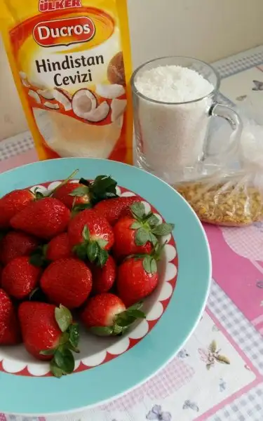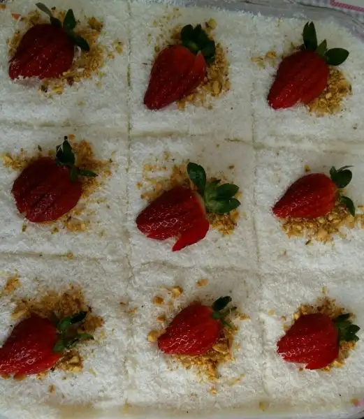 kremamızın uzerine hindistan cevzini serpiyoruz sonra istediğimiz büyüklükte pastamızı dilimliyoruz. Daha sonrasında siz istediginiz gibi süsleyebilirsiniz. Ben ise dilimlerin üzerine rondodan cektiğim antep fıstığını serptim ve yarımşar çileği dilimleyerek süsledim. Umarım beğenirsiniz.