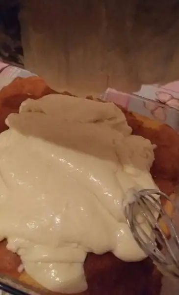 Soğuyan muhallebimizin üstüne toz krem şantimizi ekliyoruz ve belenderle bikaç dk karıştırıyoruz. Kremamız artık kekimizle buluşmaya hazır