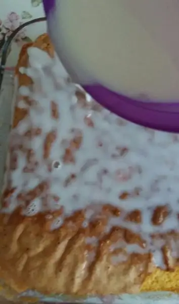 2 buçuk su bardağı süt ile yarım su bardağı şekeri, şeker eriyinceye kadar karıştırıyoruz. Kekimiz oda sıcaklığına geldiğinde şekerli süt ile ıslatıp dinlenmeye bırakıyoruz.