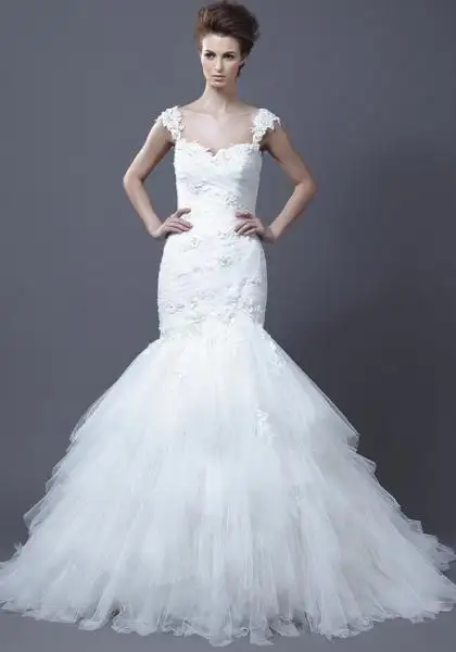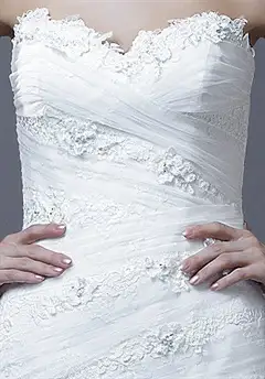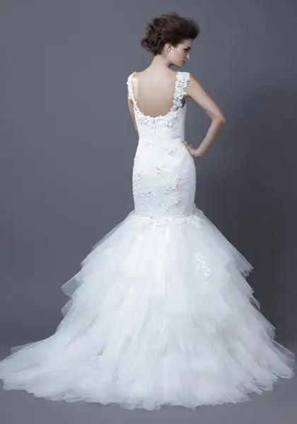 Askılı ve askısız kullanım tercihine kalmış.Gelinliğin patentli bir korsaj yapısı var.Dize kadar uzanan çıta yapısı dümdüz ve dik bir görüntüye kavuşmayı sağlıyor.üst bedeni çevreleyen farklı bir lastikli korsaj içerden çengelleniyor.Gelinliğin sırtı kapanmasada üstünden düşmesi kayması gibi bir ihtimal yok.Şifon tül asimetrik drapeler arası üç boyutlu dantel kullanılmış.İnce kumaş dokusu kesinlikle çok zarif bir görüntü sağlıyo.