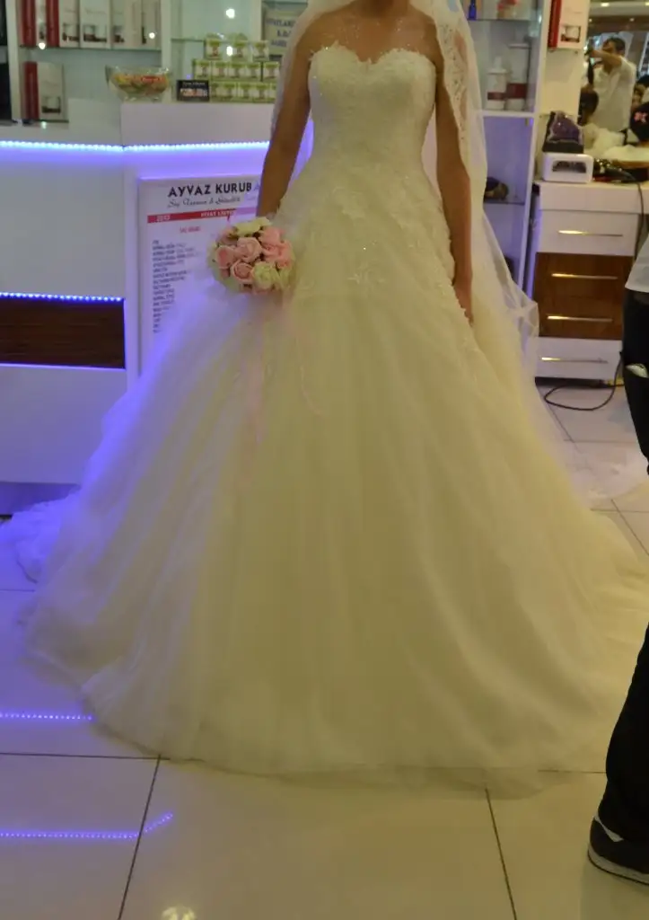 Merhaba. Viktoria Gelinlik den aldım pronovias birebirdir. Evet etek kısmındaki dantel işlemesini özellikle çıkardım. Ablam stilist olduğu için az çok fikir sahibi oldum ve etek kısmındaki dantel boyunuzu kesiyo. Aklınızda bulunsun :) Rengi inci beyazı olarak geçiyor. Fiyatta 1.000 tl olarak düşünmüştüm ama size uyan miktara düşürebilirim.merhaba,