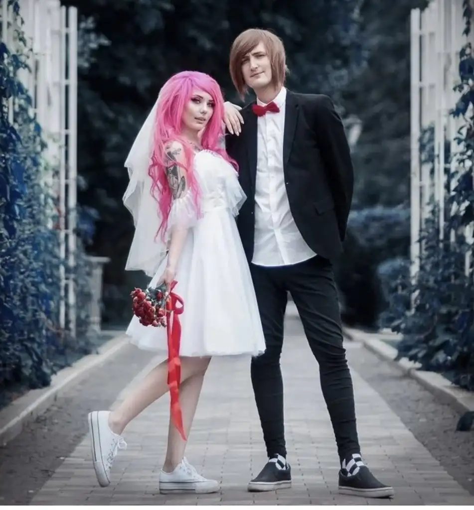 Mariannainsomnia var instagramda. Onun sayfasinda ayni kombin var ama adam tisort yerine gomlek giyip pantolonun uzerine birakmişti. Kizda da gelinlik altina converse var. Emo tarz olarak paylasmiş.😀