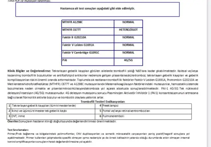 Bu nedemek peki yardımcı olurmusunuzMTHFR C677T mutasyonu pozitif cikmis, bu da ailede tasinan bir MTHFR mutasyonu oldugunu gosterir. Bunun varligi o aile icerisinde hamileliklerde komplikasyonlari artirabilir. Fakat heterozigot olmasi iyidir cunku homozigot olsa semptomlar cok daha agir olurdu. MTHFR A1298C normal, bu da guzel bir sey. Kandaki homosistein seviyeniz kontrol altinda tutulmali, cok yuksek cikarsa B vitamini, folik asit vesaire verilebilir. Hamilelik sirasinda da ayni sekilde bu tip takviyeler, gerekirse cesitli kan sulandiricilar kullanilabilir. Ben doktorunuzun onerdigi ilaclari aldiginiz ve de baska tibbi bir probleminiz olmadigi takdirde bir problem olacagini dusunmuyorum nitekim bahsi gecen bu mutasyon bircok kiside mevcut.