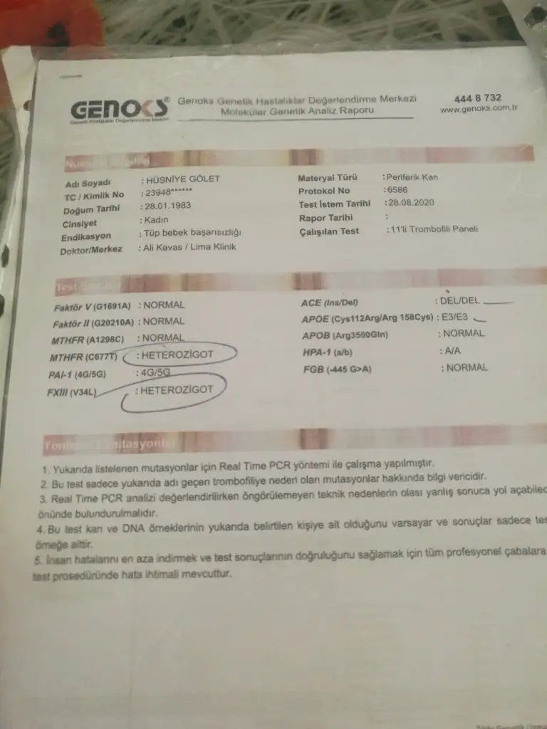 Selamlar herkese. Ekte genetik test sonucumu paylaştım. Faktör 13 V34L ve C677T heterozigot mutasyon saptanmış. Böyle olup sağlıklı gebelik yaşayan var mıdır? 2 kimyasal gebelik geçirdim.