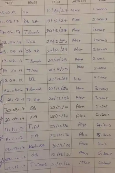 Canim benim sadece tarih yapilan bolge uygulanan lazer ve kacinci seans oldugu yaziyor bu kagittaEki Görüntüle 2077957 yok canm tarih en başta yazıo .çizelgemin tamamı bu