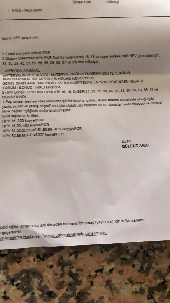 Ben bu testi 2019 yılında yaptırdım sonra gidip alma imkanım olmadı. Bugün tekrar gittim ve kadın doğum doktoru beni onkolojiye yönlendirdi. Onkoloji doktoru testin tekrarlanmasını istedi ve sonucuna göre parça alınacağını söyledi negatif gelme ihtimali var dedi ama bence yok çünkü yıllardır vajinamda bu siğiller mevcut (2019dan çok öncesinde vardı