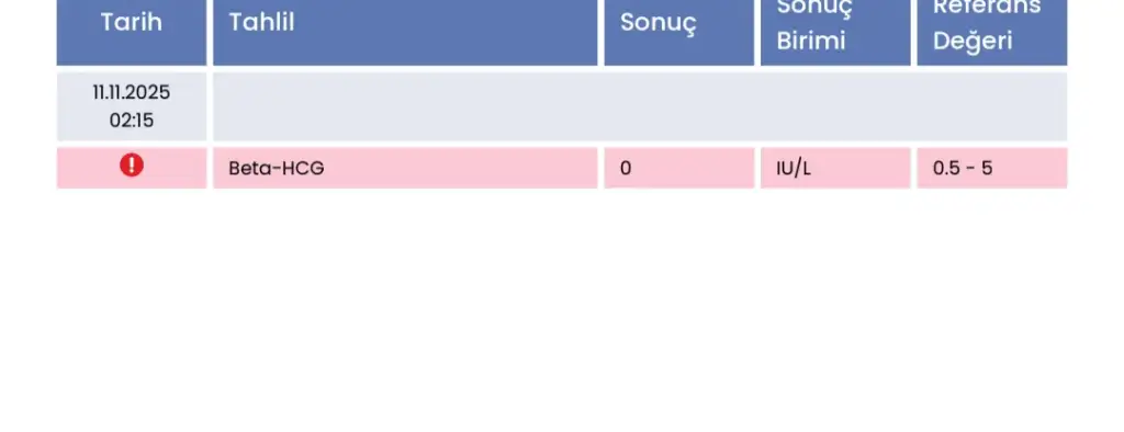 Benim negatifken <0,1 yazıyordu onu bile anlarım da direkt 0 yazanı da ilk defa görüyorum. Garip geldi. Referans değeri bile 0,5 ile başlıyor. Garip bir laboratuvar….adetim 8 Ekim'de basladı 13 ekimde bitti, 22 Ekim'de ovulasyon testi pik idi, 5 kasımda adet olmam gerekiyordu henüz olmadım şu an 6 gün gecikti beta hCG bu sekılde hamile olabilir miyim
