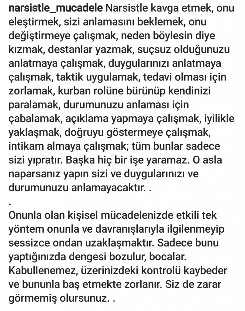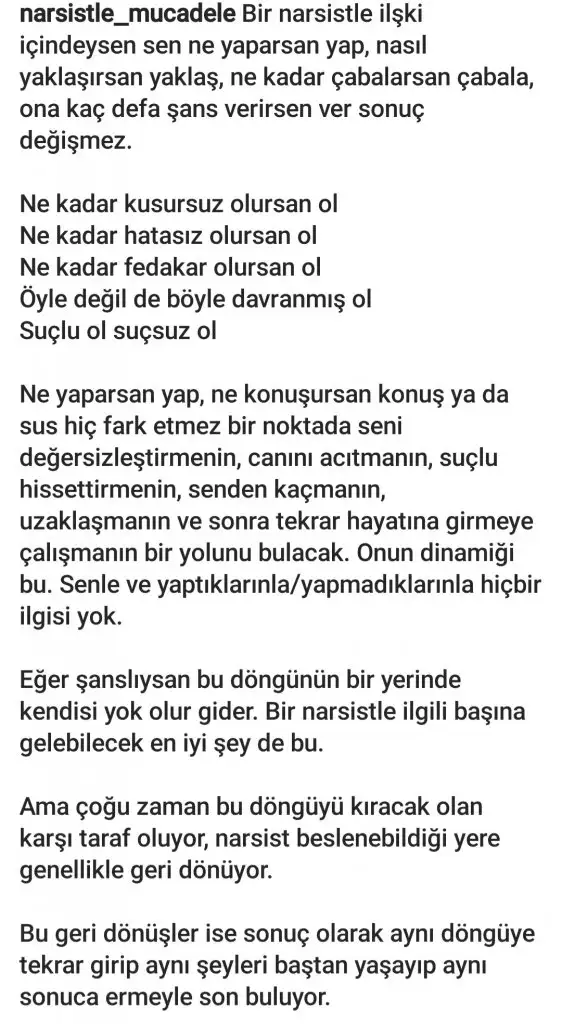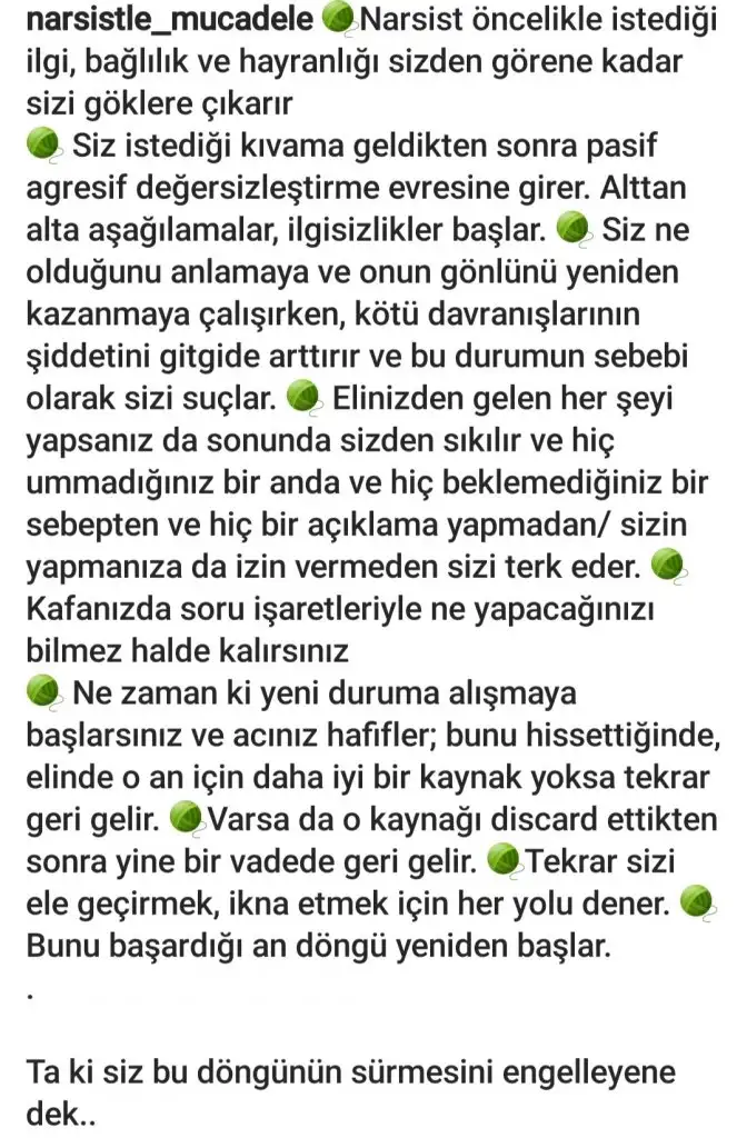 . Tepki bile veremedim. Okuduklarim narsist kisilil bozuklugu tabi benim vazgecememem benim ayri sorunum oldugunu gosteriyor. Nasil vazgecerim ..