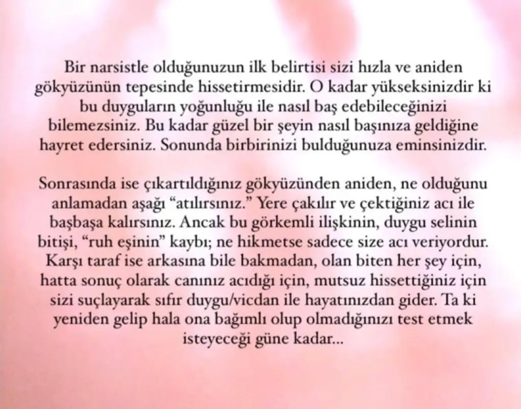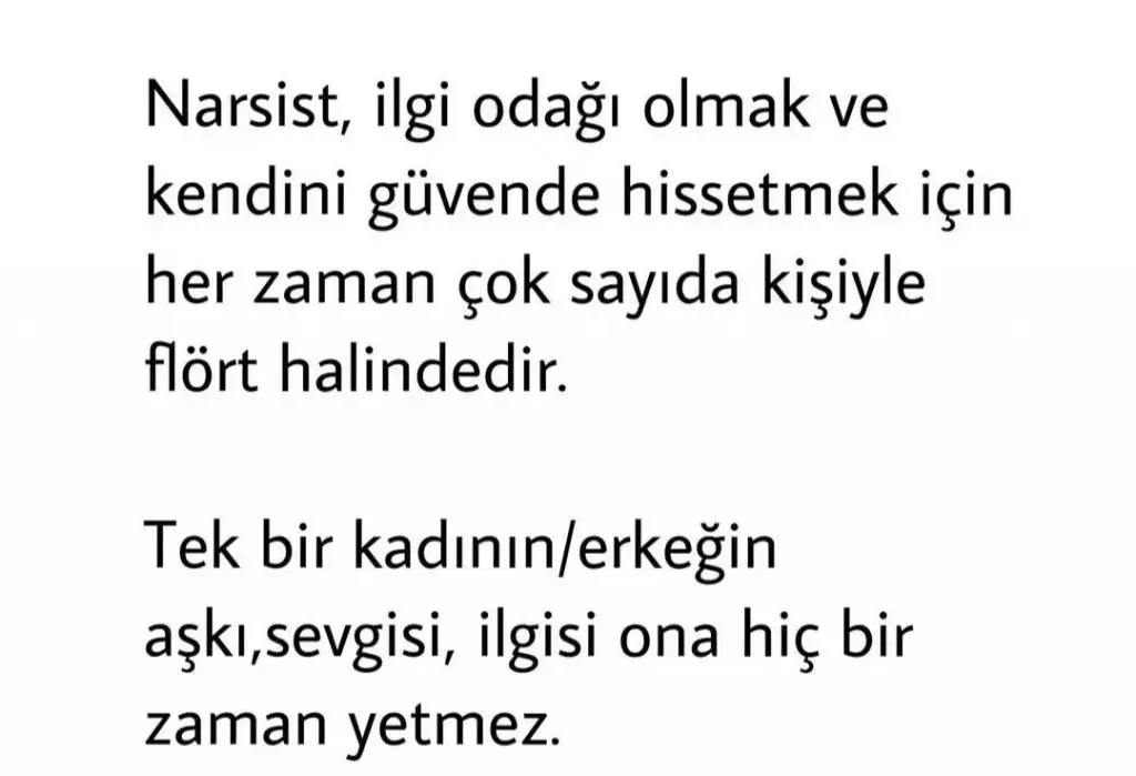 Benim psikoloğumun bana dediği cümle şu; narsist kişileri terapiye dahi almıyoruz. Çünkü uzun yıllar boyunca terapi süresi