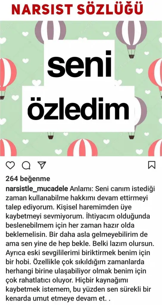 çok geçmiş olsun. İlgi alanın gerçekten çok işine yaramış.benim uyanmami saglayan bu notlar oldu. not tutmasi sayesinde erken fark ettim. kendimi bildim bileli deli gibi psikoloji kitaplari okurum, makaleler incelerim. o sayede bunun boyle not tutmak, herkesi kucumsemek, manipule etme cabalarini ikinci ayda fark edip ucuncu de kacmayi basardim. sonra dolayli yoldan ogrendim kompulsif narsisistmis zaten. not tutmasiyla ayni donem baslayan "senin iyiligin icin" zirvasi da vardi. kendi istedigi herhangi bir seyi yaptirmak icin "sunu senin iyiligin icin istiyorum, zaten bunu yapman en dogrusu sen de biliyorsun degil mi?" vs derdi. nasil kurtuldum bilmiyorum gercekten