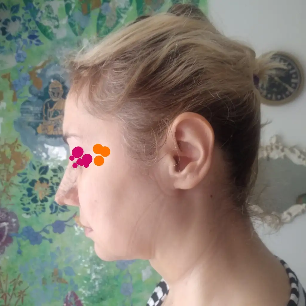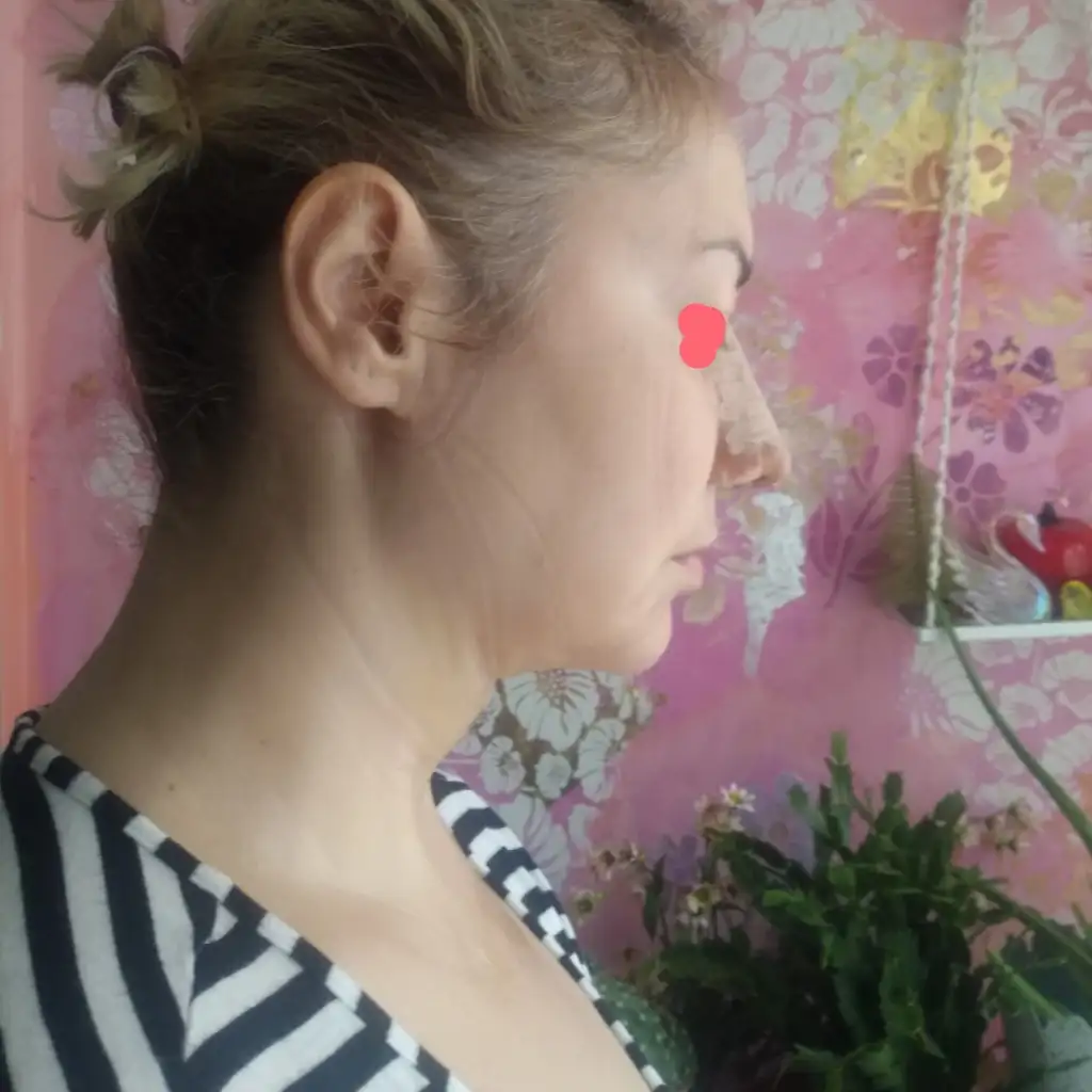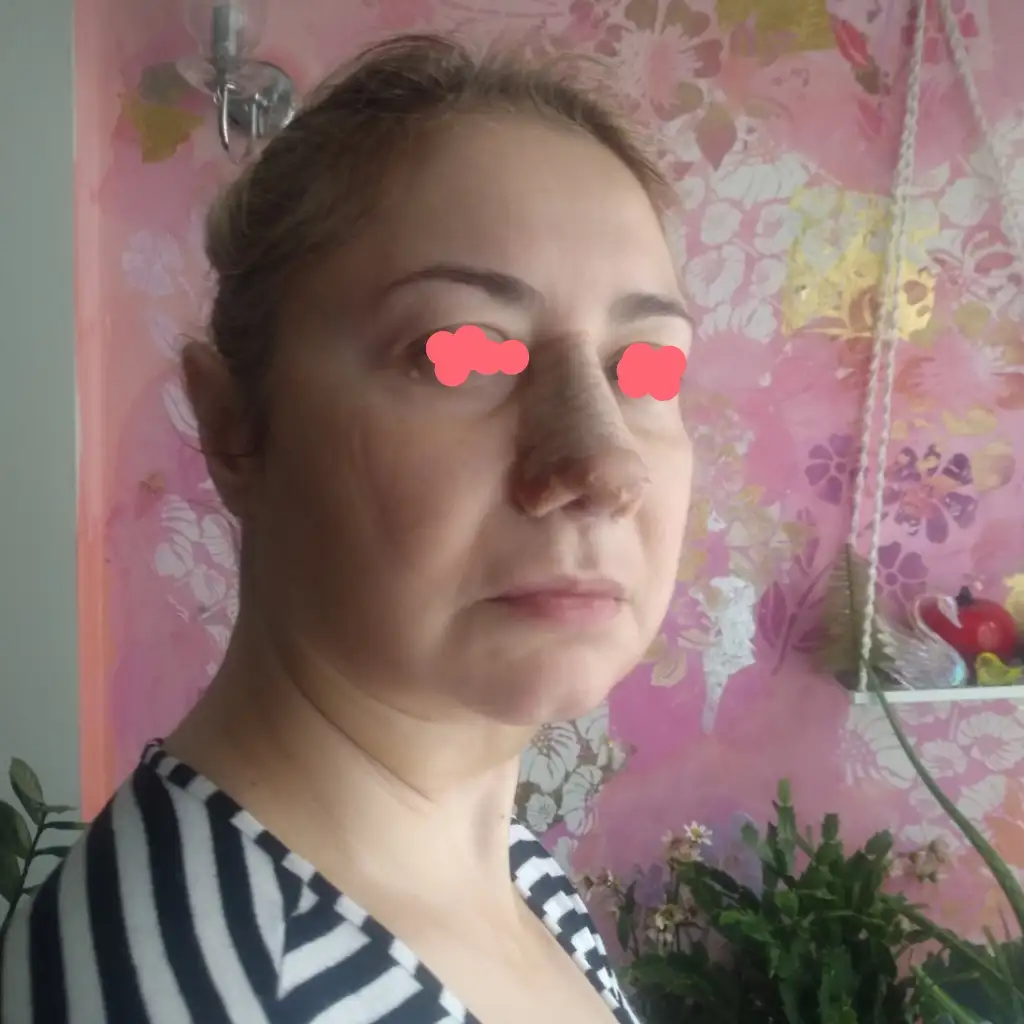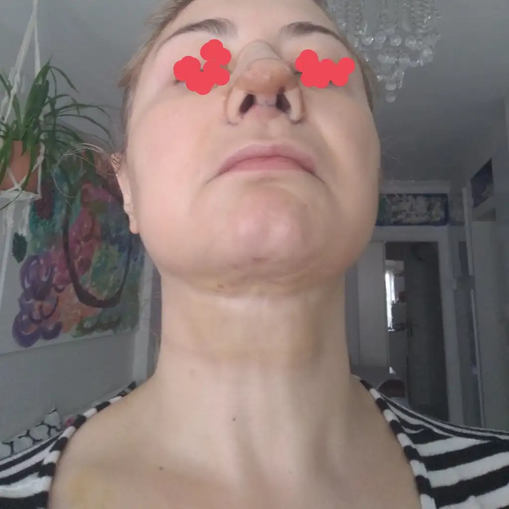 3. Haftaya girdim, iz, dalgalanma, oluklaşma, sertlik, boynu geri atamama, dışarıdan görünmeyen ama ele gelen ağrılı şişler var. İnfrared ışık ve masaja devam ediyorum, burun, telefon kamerası yüzünden büyük çıkmış, şiş var ve burun deliklerimden biri üçgen, bantın geldiği yer, çok erken olduğu için bir şey demiyorum, genelde düzelmiş herkesin ki