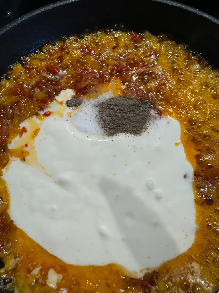 Krema, karabiber, tuz ve parmesan peynirini de ekleyerek güzelce karıştıralım.