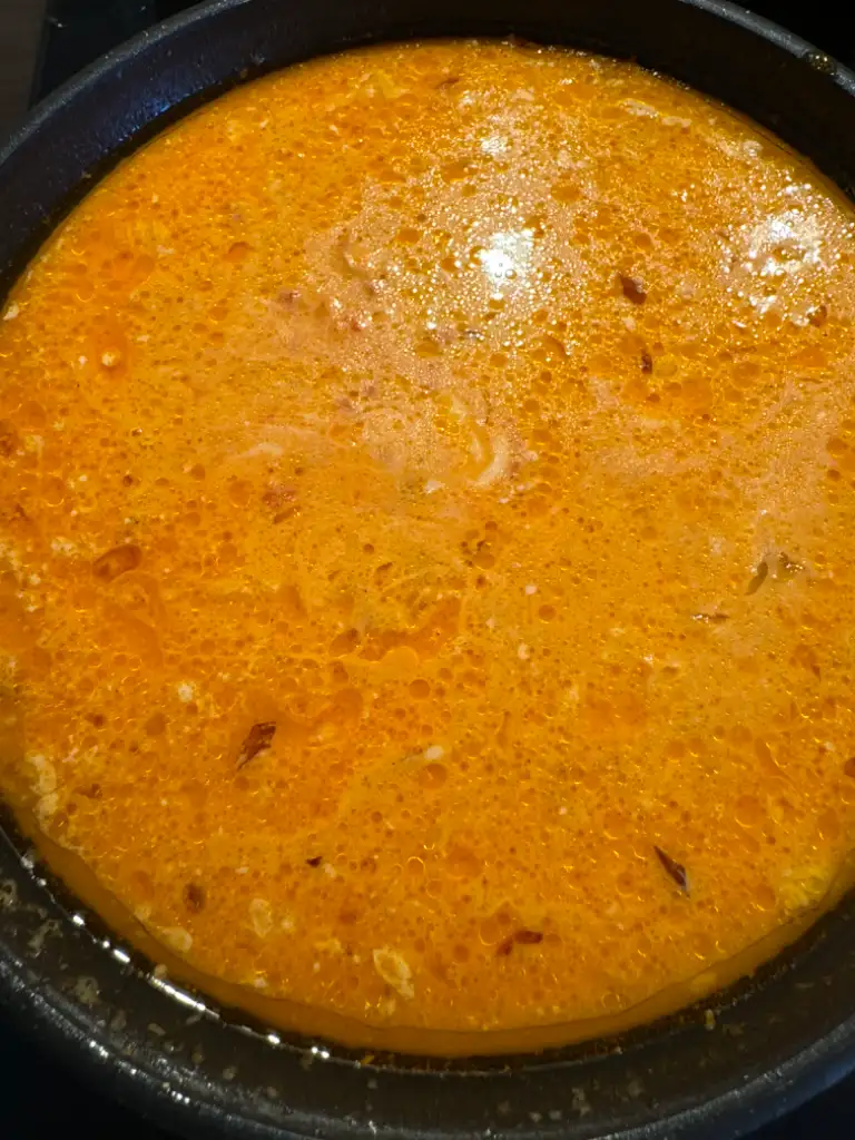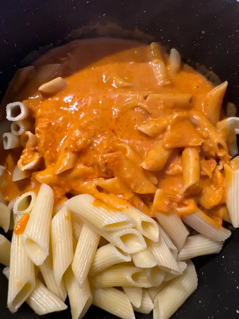 Kaynayıp koyulaşan sosumuzun üzerine ayırdığımız haşlanmış makarna suyunu ekleyerek en kısık ateşte 2 dakika kadar karıştıralım.