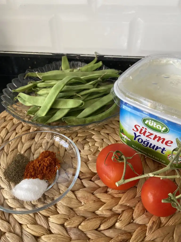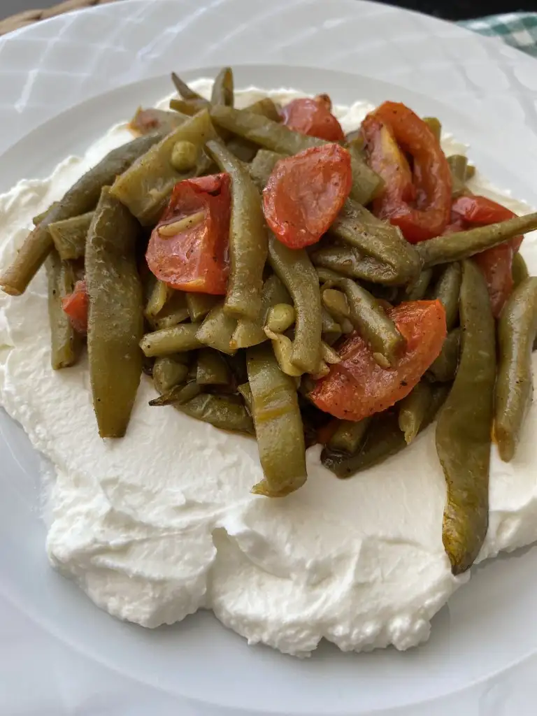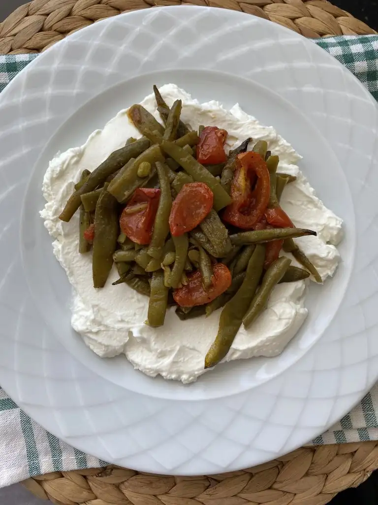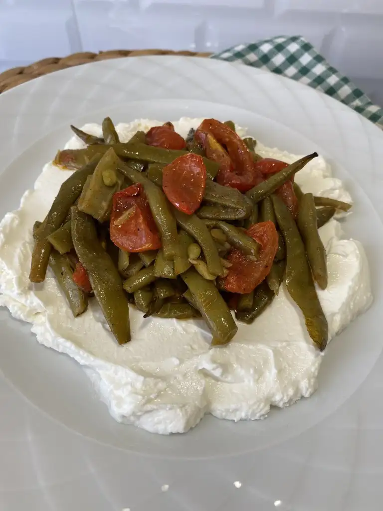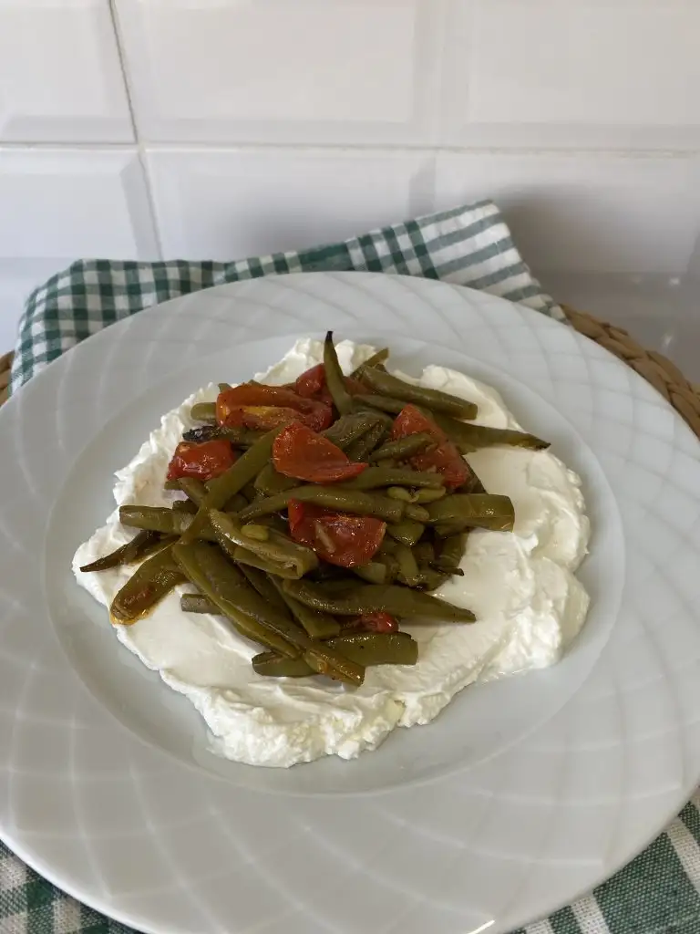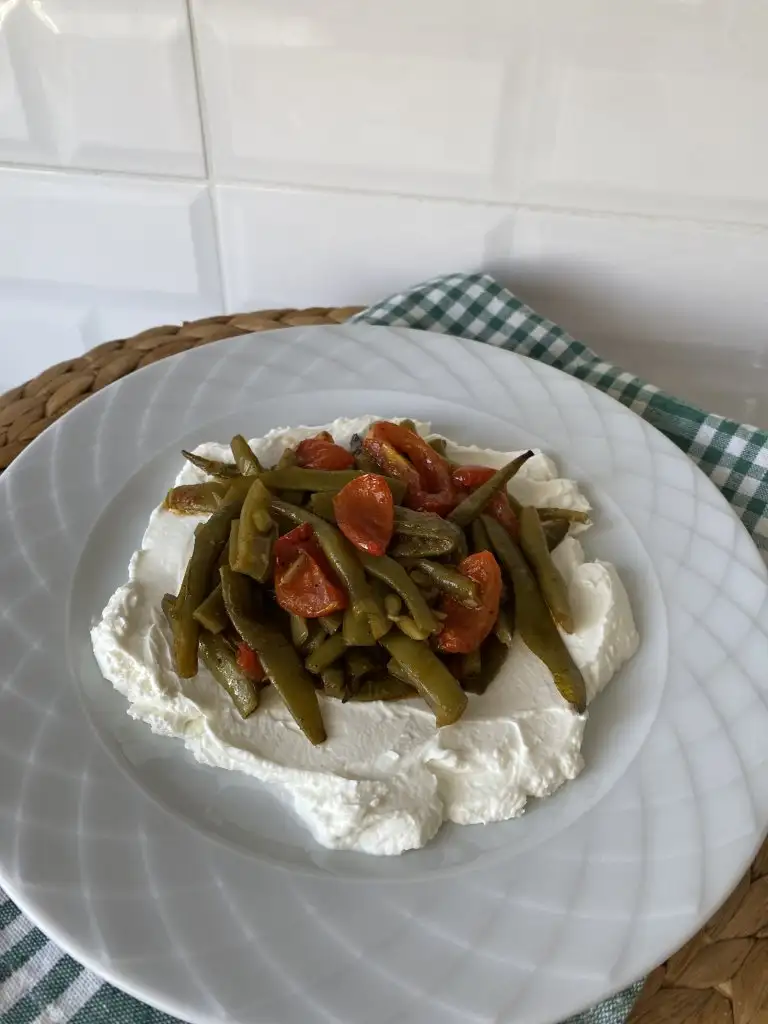 Fırından çıkardığımız taze fasülyeyi ilk sıcaklığı gittikten sonra yoğurdun üstüne servis ediyoruz.