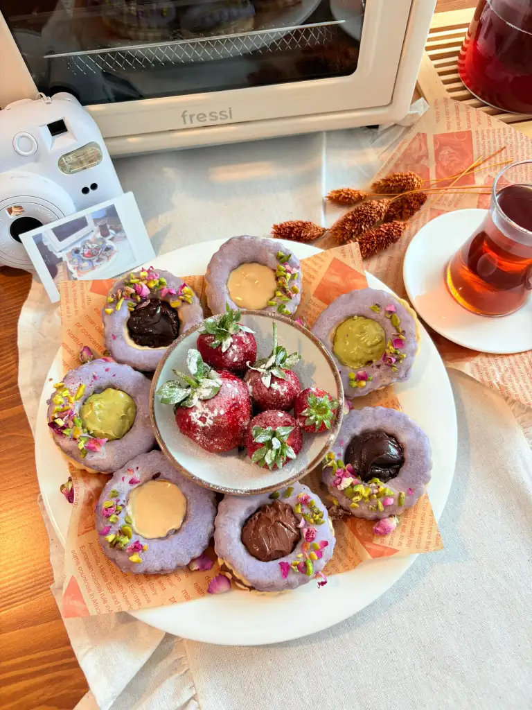 Ortası dolu olan kurabiyelerimize krema sıkıp glazürlü olanları kapatalım. 1 saat dinlendikten sonra servis edebilirsiniz.