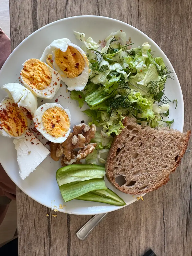Kahvaltı: 2 haşlanmış yumurta, 1 yk keten tohumu, 1 çk çörek otu, 2 yk lor, çeyrek avokado, 1 dilim ekmek, yeşillik, kapya