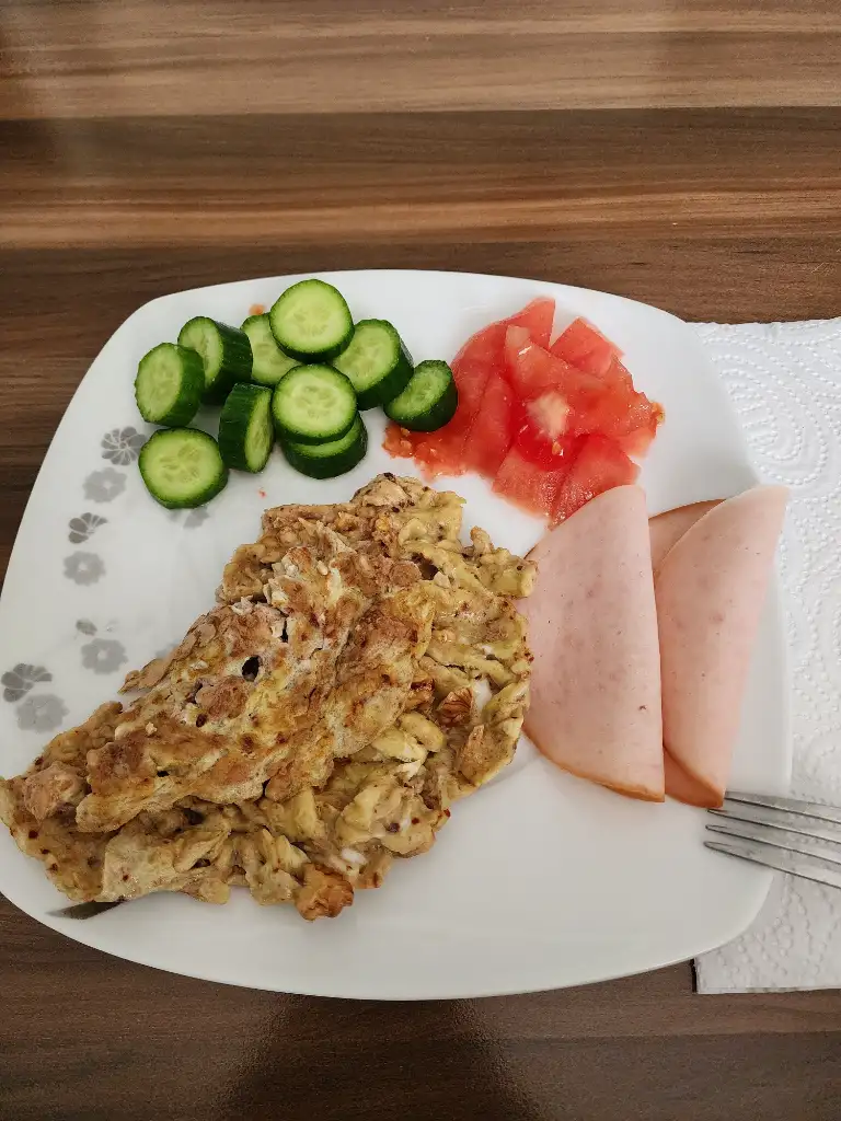 Yumurta, cottage cheese, salatalık, zeytin, wasa, kahve