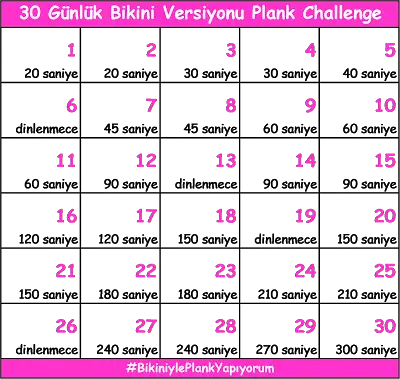 plank bu hareketler, tablodaki her gün icin yazan saniye ise o gün her bir hareketin pozisyonuna gelip durman gereken süre. bi hareket bitince hic bozmadan digerine gecip yine o kadar saniye kadar durmak gerekiyor