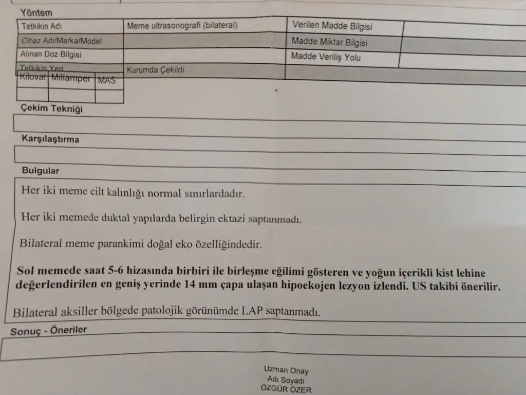 6 ay sonraki kontroldeki durumuna göre mr istenir dedi radyoloji doktoru. Zaten kadın doğum doktoruna gitmiştim aslen çünkü tekrar süt ürettiğimi sanmıştım başta akıntım vardı. Böyle bişey düşnümedim. O yüzden daha ileri gideceğini de düşünmedim çünkü ilerleyen bi farklılık yoktu. Genel cerraha randevu aldım belki de gerçekten kötü bişey değil iyi bişey bilmiyorum yani
