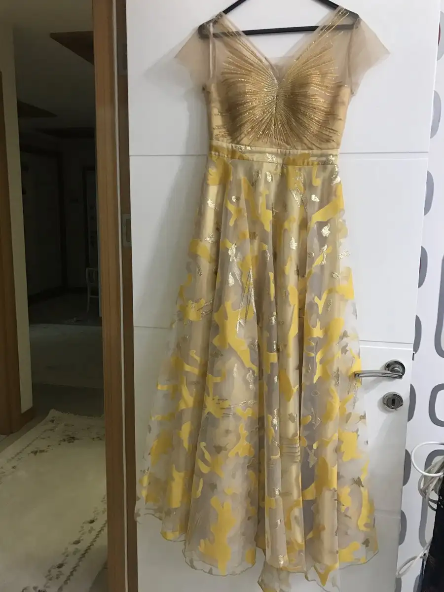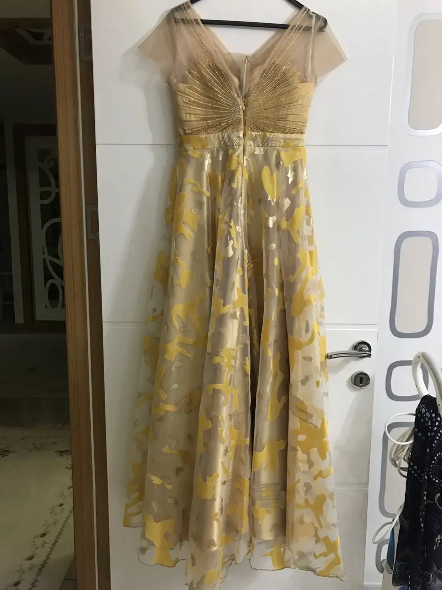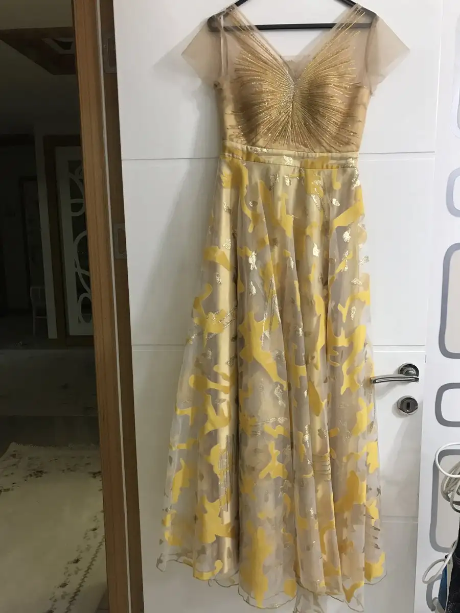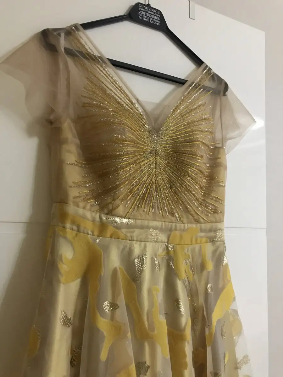 gold abiyemi bir kez giydim kuru temizleme yaptırdım uygun fiyata satmak istiyorum sökük yok sıfır koldu normalde elbisenin hayalet tülünden kol yaptırdım isterseniz çıkartabilirsiniz 36 38 rahatlıkla olur