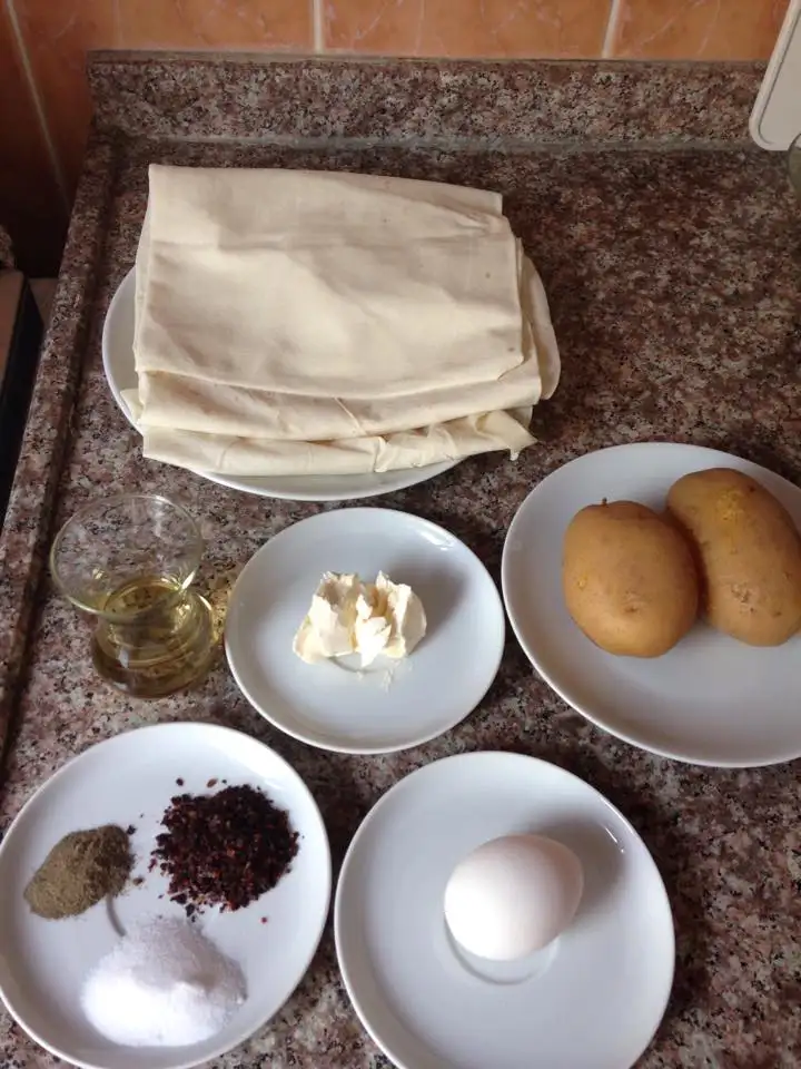 Patatesler haşlanır. Baharatlar ilave edilir. Yufka 4e ayrılır. Eritilen margarin fırça yardımı ile yufka üzerine sürülür.