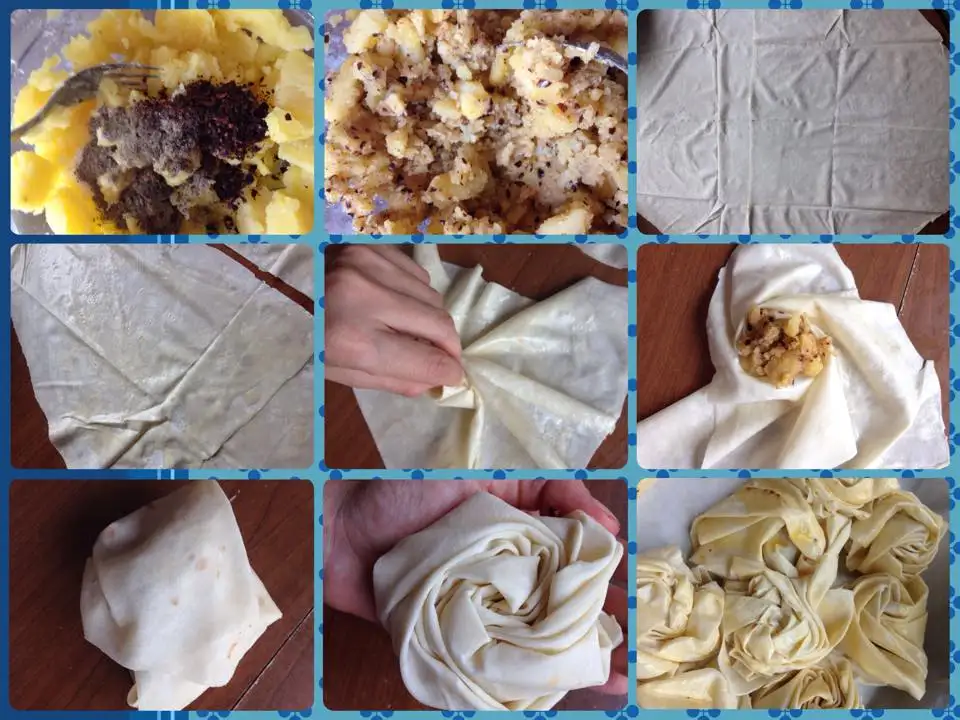 Başparmak, işaret parmağı ve orta parmak yufkanın ortasına konularak saat yönünde çevrilir. Ortada oluşan çukurun içine bir tatlı kaşığı patatesli harçtan koyulur. Çevrilen yöne doğru yufkalar ortaya doğru kapatılır. Şeklinin bozulmamasına dikkat edilerek kapatılan yer altta kalacak şekilde ters çevrilerek tepsiye dizilir.