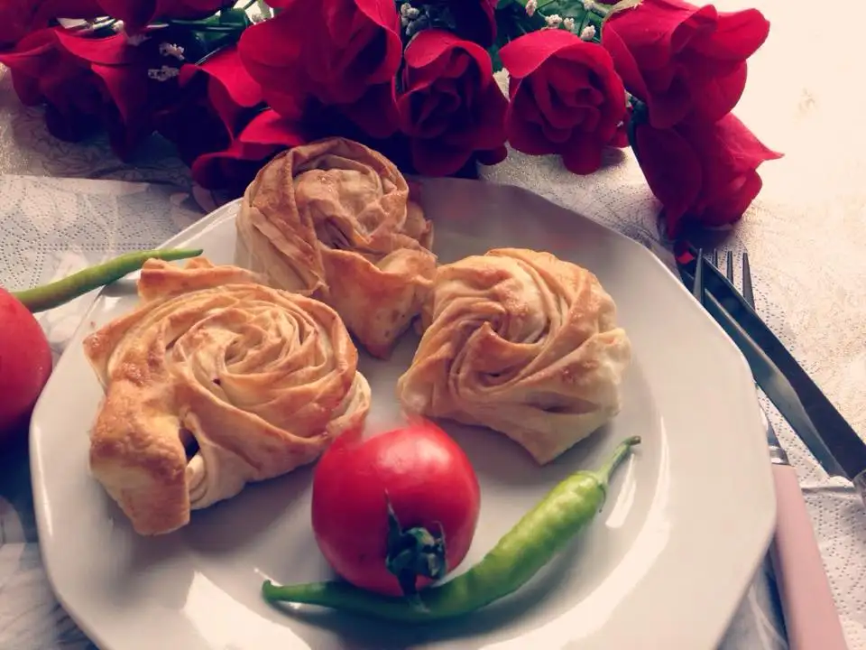 şimdiye kadar gördüğüm en güzel gül böreği :) daha çok gül diye salyangoz tarzı bişiler yapıolar..