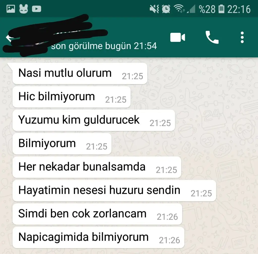 Kızlar ben boşanıyorum, dini nikâhımızı fesh ettik, dilekçemizi verdik. Eşim istemiyordu ama ben çok istedim. Zor zamanımda yanımda olmaz oldu, en ufak tartışmada ulaşılmaz olurdu. Ne konuşabilirdim ne de anlasabilirdim. O istemediği vakit ben onun vicdana gelip de bana ulaşmasını beklerdim. Bugün yaşanan tartışmadan sonra madem mutlu olamayacağız bitirelim dedim. Çoluk çocuk olmadan daha fazla birbirimizi üzmeden..