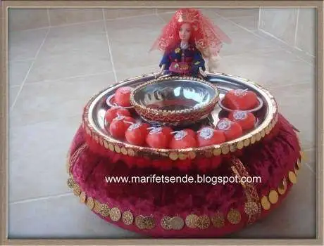 Altta resmini göreceğiniz kına tepsisi de aynı kumaşla yapılırsa on numara olur.