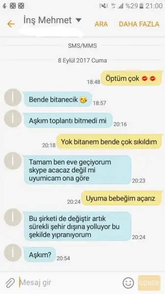 Biz güzel güzel yemek yerken ben lavaboya gitmek üzere masadan kalktım. Telefonumu da çantama attım kalkarken,tuvalete girdim mesaj geldi (annem ile gecenin dedikodusunu mesajla yapıyorduk) annem sandım açtım. Mesaj şu “aşkım??” mesajı atan kişide inş Mehmet. Böyle bir tanıdığım yok diye düşünürken aslında görümcemin sözlüsünün telefonunu aldığımı fark ettim. Şok oldum,mesajların yukarısına da baktım belki yanlış diyeceksiniz ama bakmasam duramazdım.