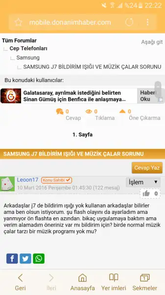 Eee siz biraz önce herhangi bir ışık yanmıyor dediniz, bildirim ışığı diye ben dedim. "Samsung galaxi j7 model telefonda mesan gelince yanan herhangi bir ışık var mı bakabilirsiniz. Kullananlar illaki vardır söylesinler." Mesajınız bu.O bildirim ışığı değil doğru düzgün okusaydınız flash ışığı olduğunu görürdünüz. Bildirim gelince araba fari gibi yanıyor o ayari açınca. Işık değil flash çünkü ve kullanan kimseye de rastlamadim.