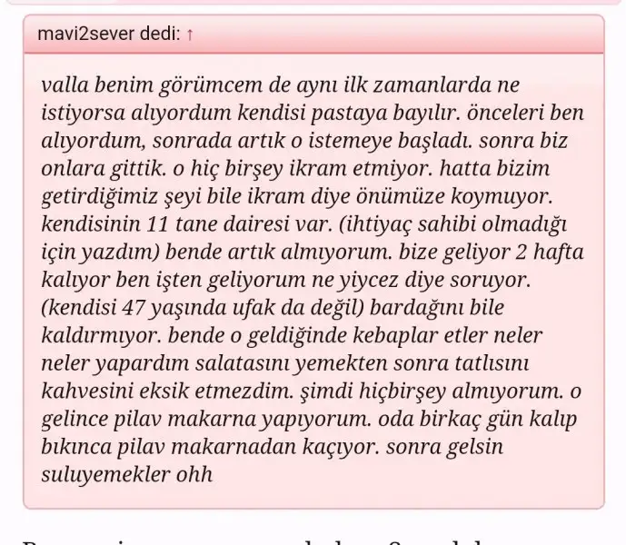 Konularında yazmamış da bir arkadaş alıntı yaptı başka bir konuya yorumunda evliymiş gibi.görümcem bize geliyor kalmaya hiçbirşey yapmıyor ben ona pastalar falan yapıyorum onu bunu yapıyorum biz gidince o önümüze birşey koymuyor bende o gelince makarna pilav yapıyorum sadece çok kalamıyor gidiyor demiş daha nişanlıyken görümce neden gelip günlerce kalsın eşim demiş zaten orada zaten dedikleri mantıksız konu değil diğer konulara yazdığu mesajlara bakınca anlaşılıyor