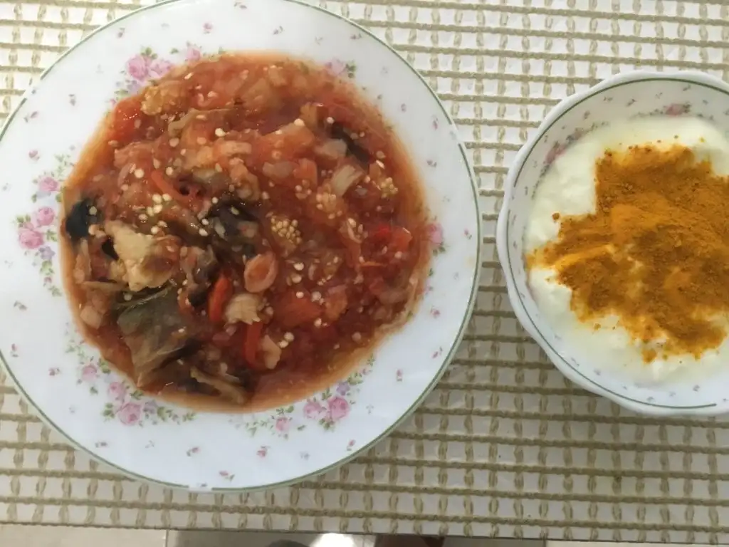 akşam öğünüm domates soslu közlemiş sepze (Patlıcan,yeşil biber, kırmızı biber) Zerdeçallı yoğurt eşliğinde