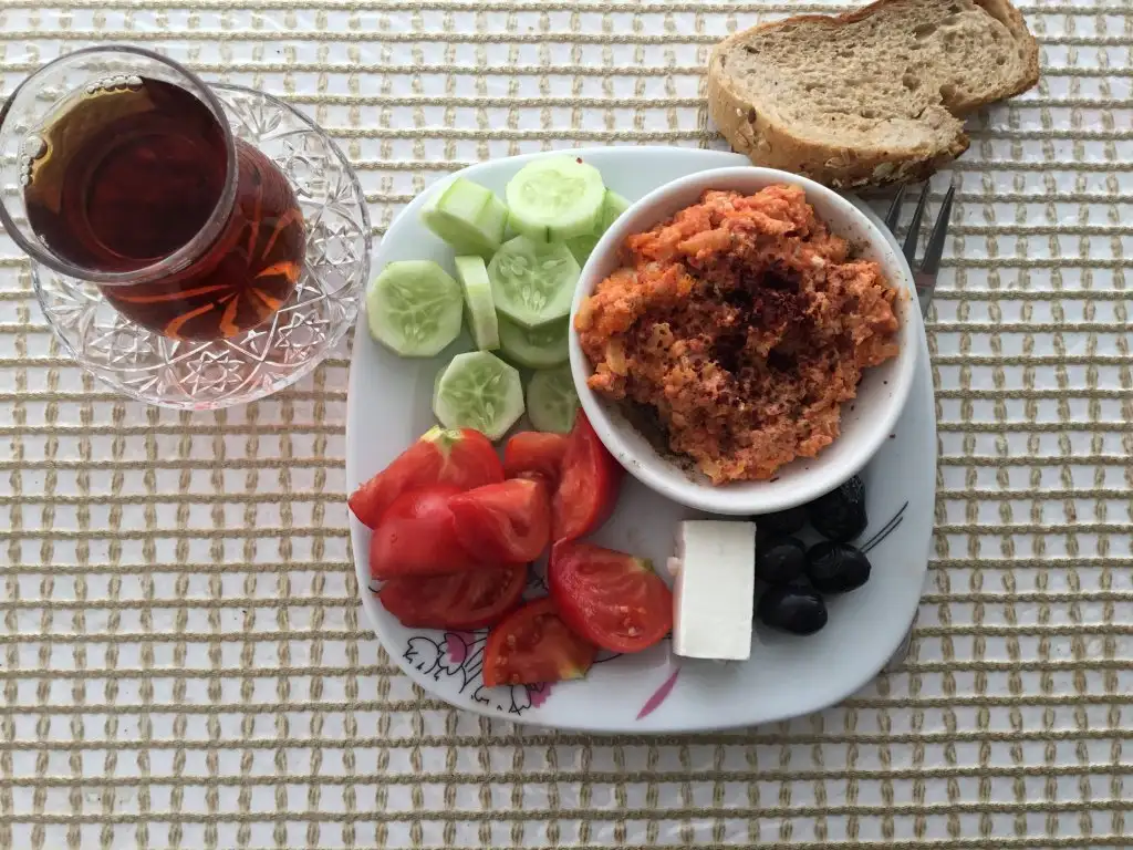 1 dl beyaz ekmek, 2 dl peynir, domates, 5 zeytin, çay