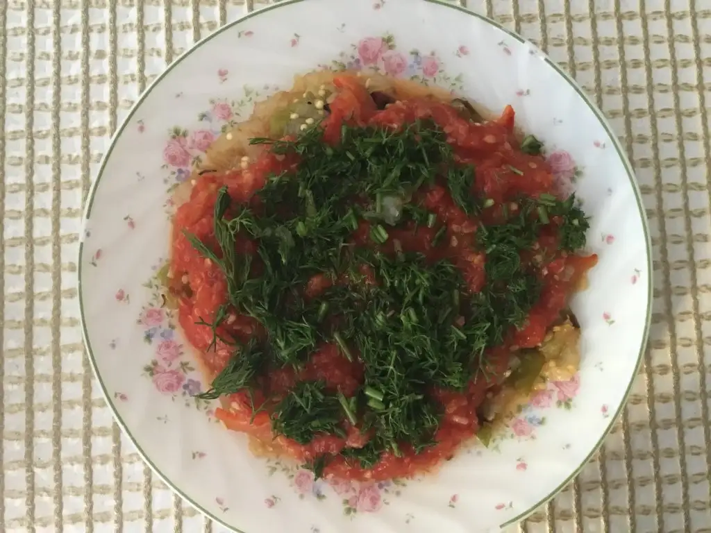 1 köz patlıcan 2 köz yeşil biber 1 köz kapya biber üzerine domates sos dere otu