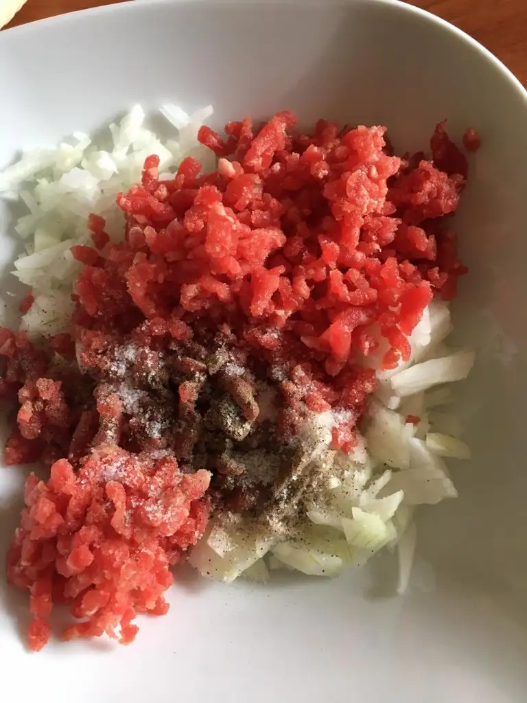 Kıyma, doğranmış soğan, tuz, karabiber ve azıcık yağ ile iç harcımızı hazırlıyoruz.