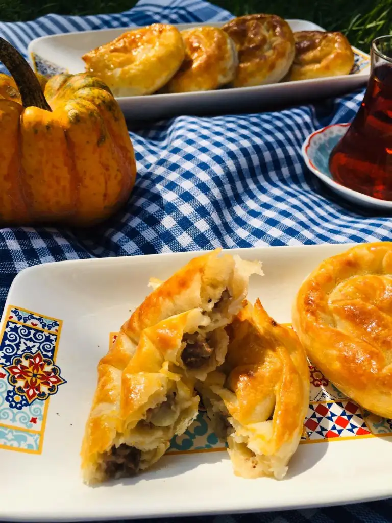 Kıyma harcımızı şerit halinde yufkamıza serip, ince rulolar yapıyoruz. Ardından kendi etrafında dolayıp, Gül böreğimizi yapıyoruz.